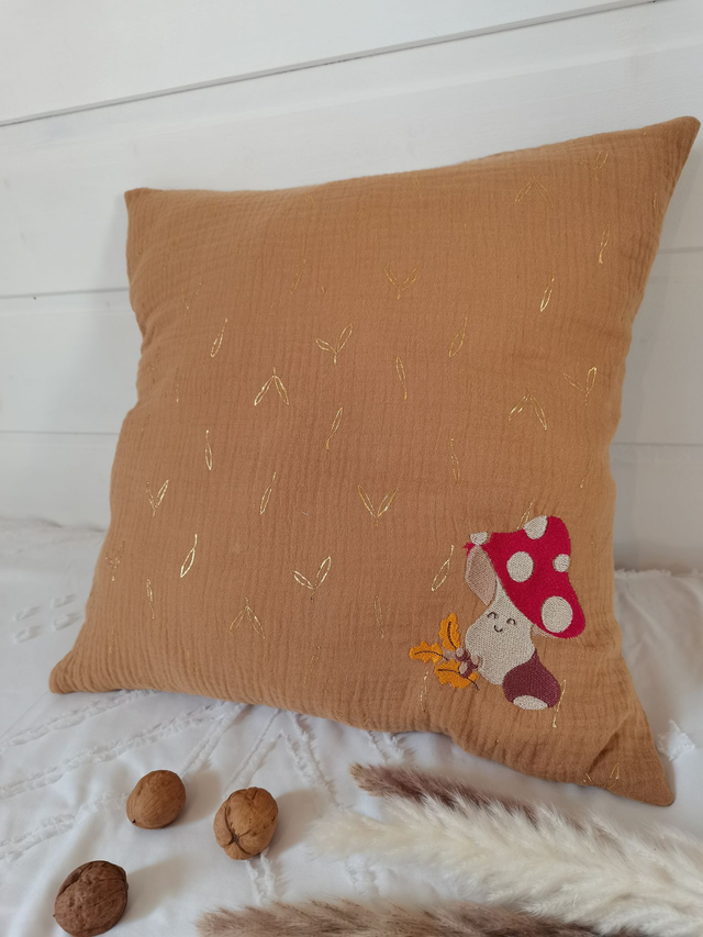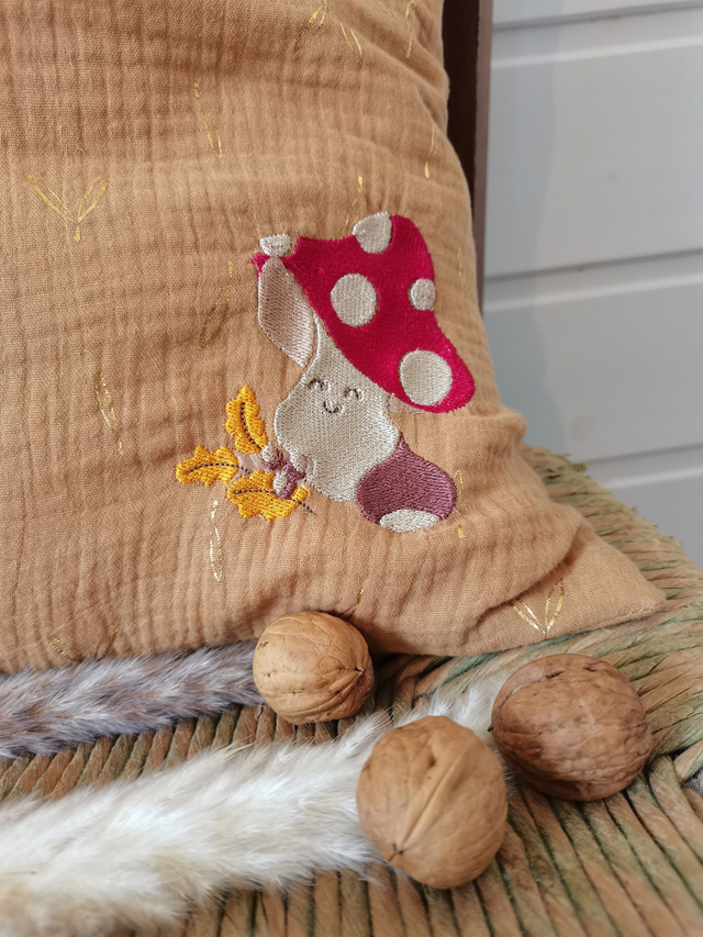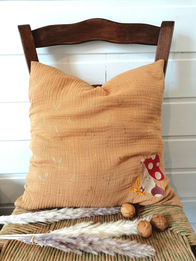 Cette housse de coussin 40×40 en gaze de coton couleur cannelle apporte chaleur et poésie à ton intérieur. Son petit champignon brodé, imaginé et dessiné par mes soins, évoque la douceur, l’enfance et les mondes imaginaires qui font sourire.