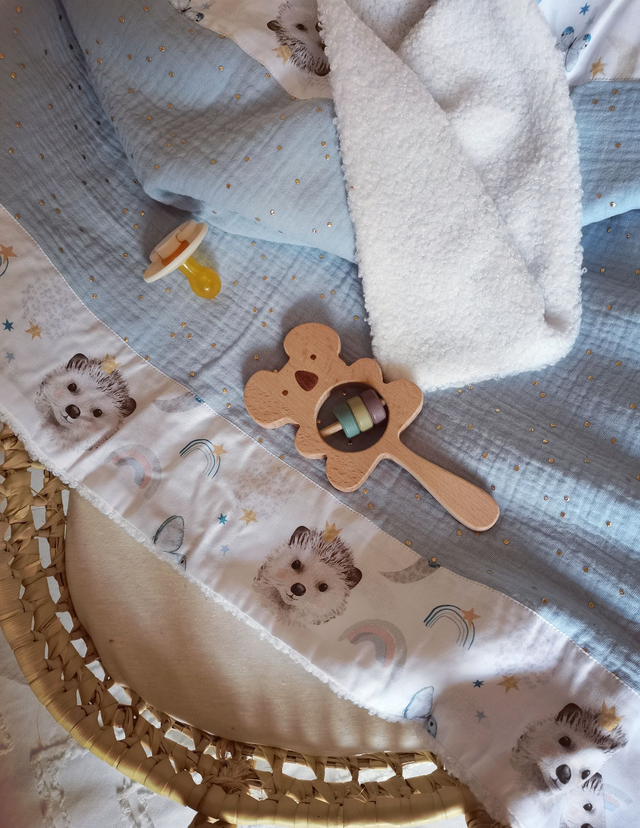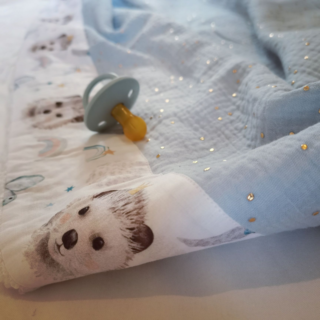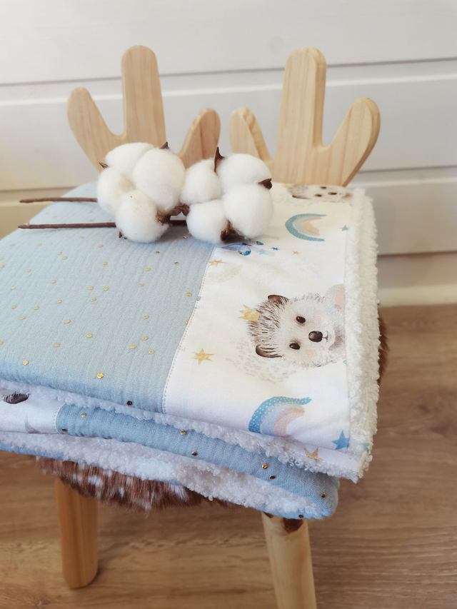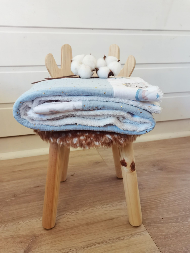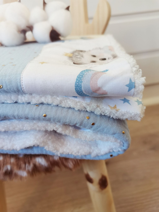 Cette petite couverture est conçue en double gaze de coton avec une bordure en cretonne de coton sur une face et doubler par de la fausse fourrure sur l’autre face.